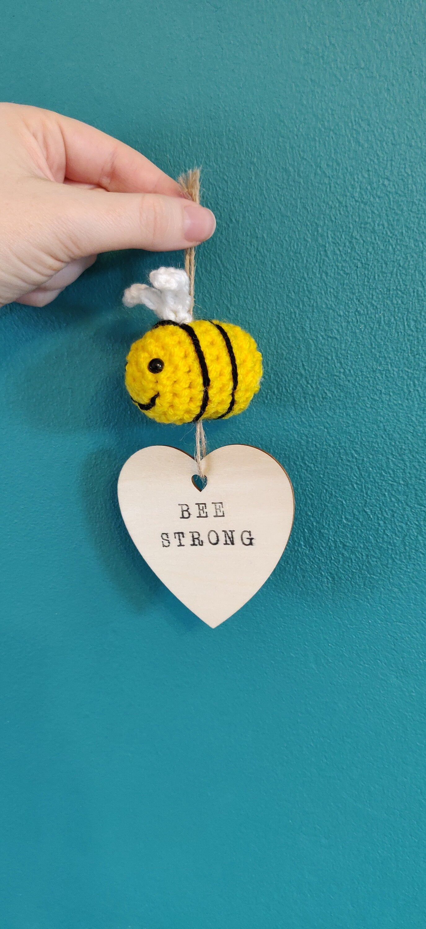 This cute bee strong sign has a wooden heart with 'bee strong' hand stamped onto it. I have also crocheted a mini bumblebee which sits on top of the wooden heart.