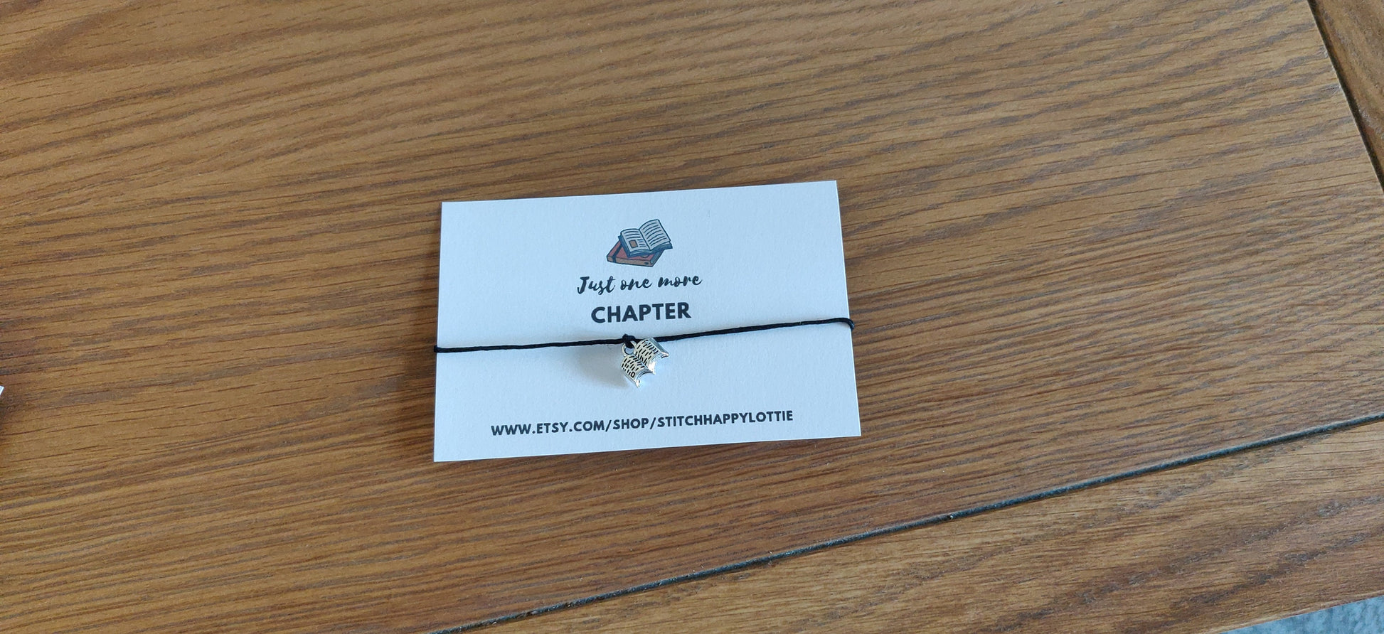 This cute charm bracelet has a silver coloured charm of an open book on a black adjustable cord bracelet.