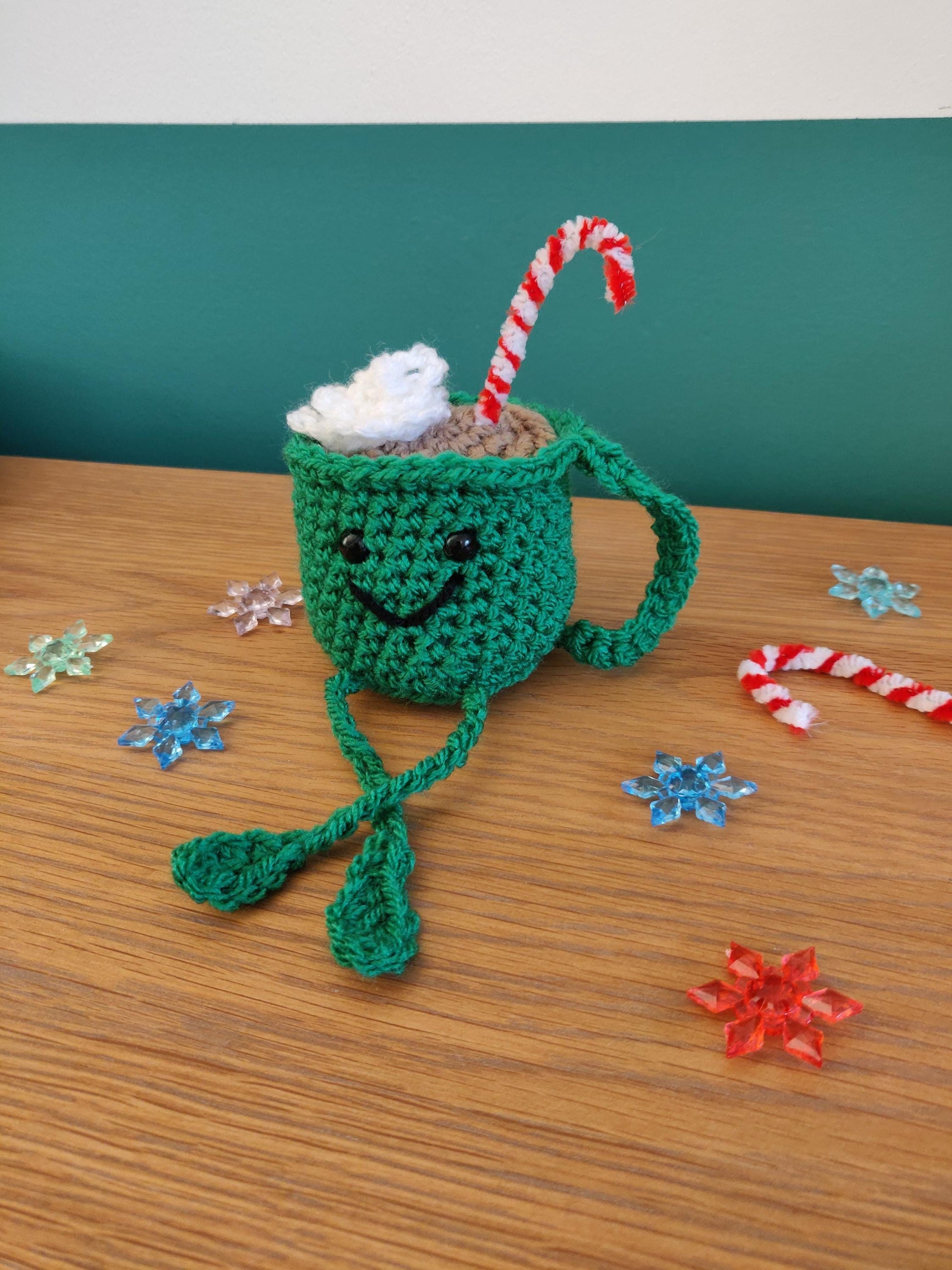 This green crochet hot mug has a happy smiley face with a creamy brown cocoa, whipped cream and candy cane. It would make an ideal decoration for a hot chocolate station.