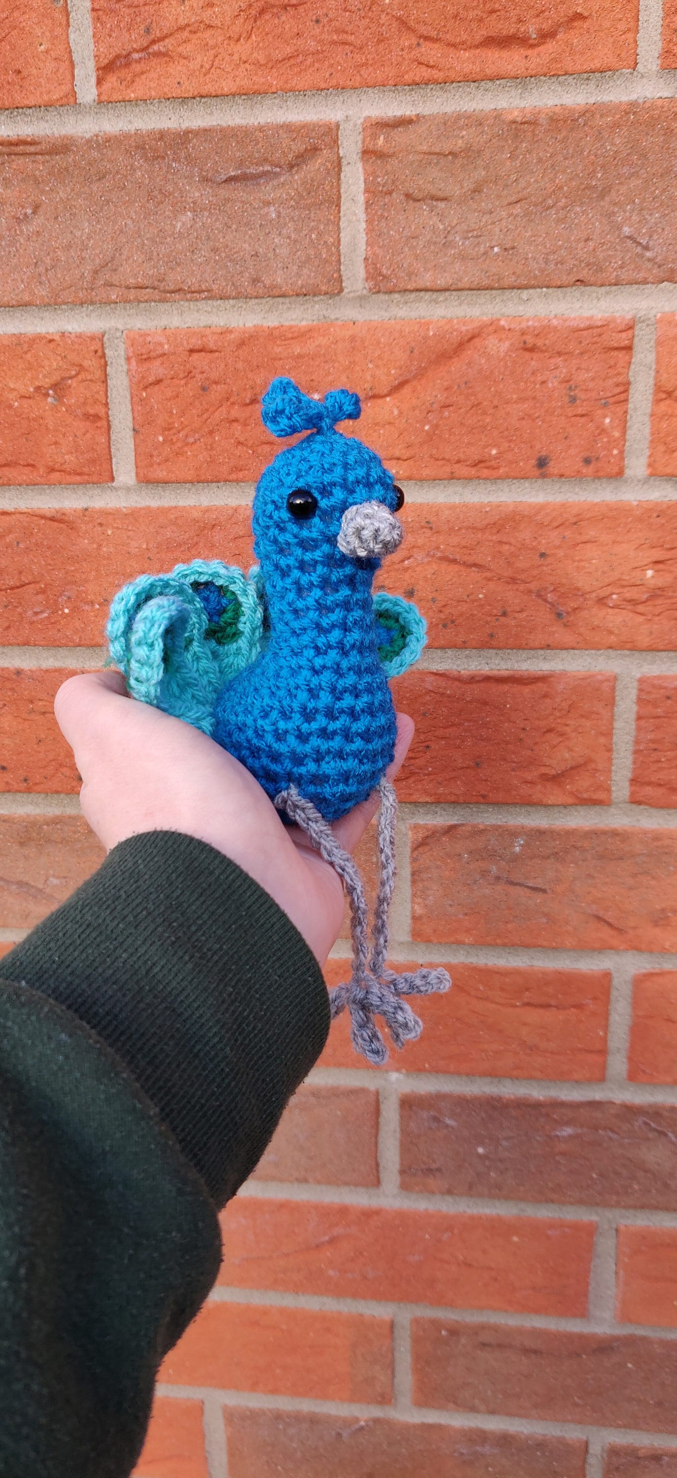 This crochet peacock has been crocheted in beautiful blue and green for a bold design.