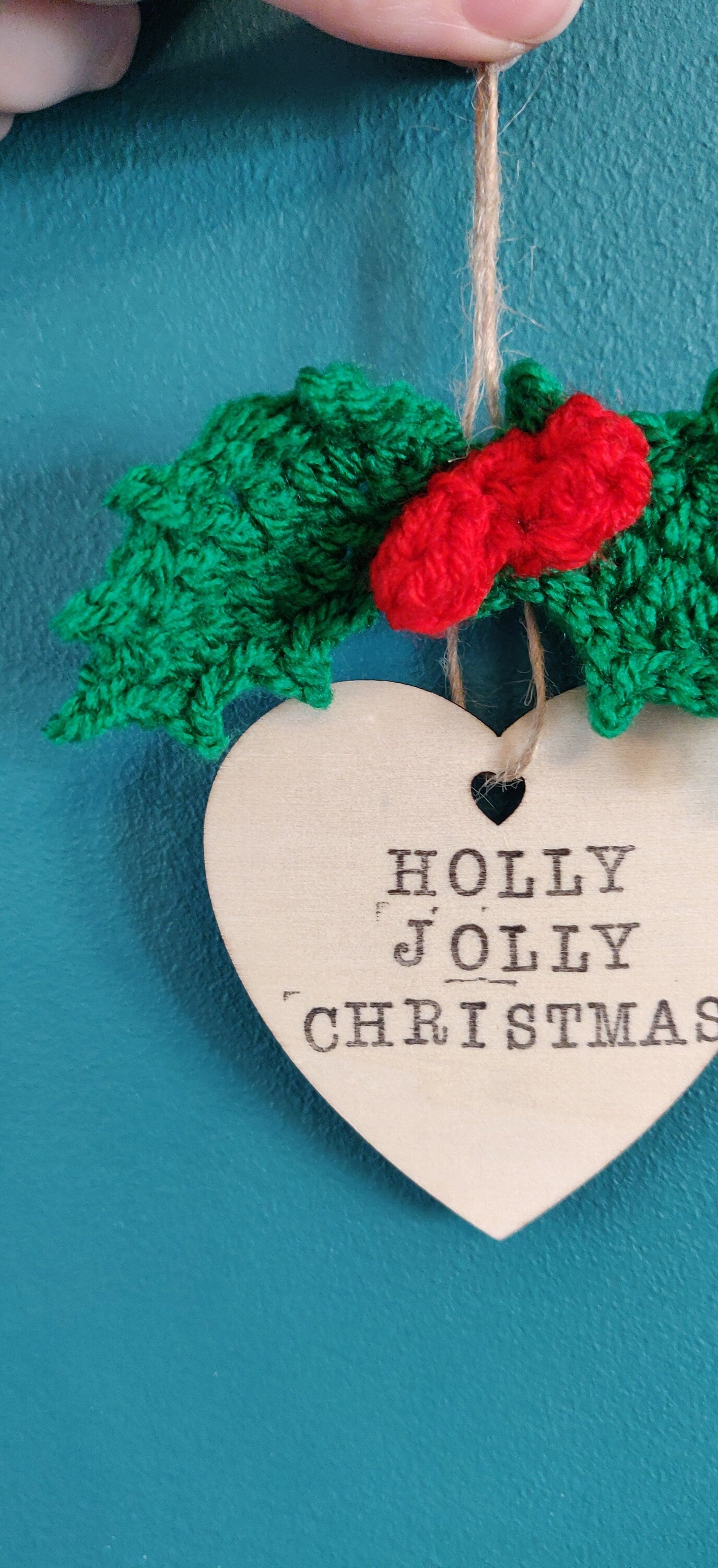 It has a wooden sign with a personalised hand stamped message and crocheted Holly and berries. I have made two Holly leaves and two red berries.