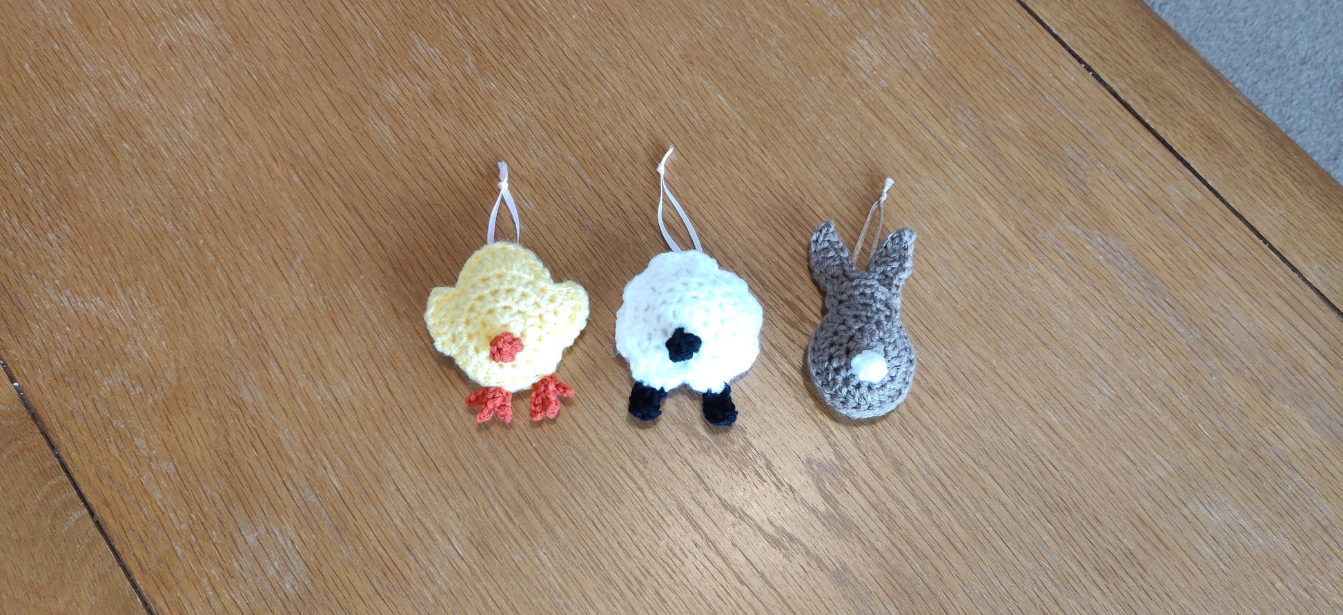 The five decorations are a white lamb, yellow chick, brown bunny, carrot and grey bunny which make a beautiful collection.